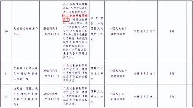 5月29日,中国人民银行廊坊市分行发布的行政处罚信息显示,大城县农村信用合作联社因“未按规定履行客户身份识别义务;违反金融科技管理规定;提供个人不良信息,未事先告知信息主体本人”等5项违法行为,被警告,并被罚款49.5万元。