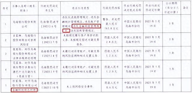 5月27日,中国人民银行乌海市分行发布的行政处罚信息显示,乌海银行因“违反反洗钱管理规定、违反金融统计管理规定、违反账户管理规定、违反金融科技管理规定、违反国库管理规定”等5项违法行为,被警告,并被罚款163.8万元。