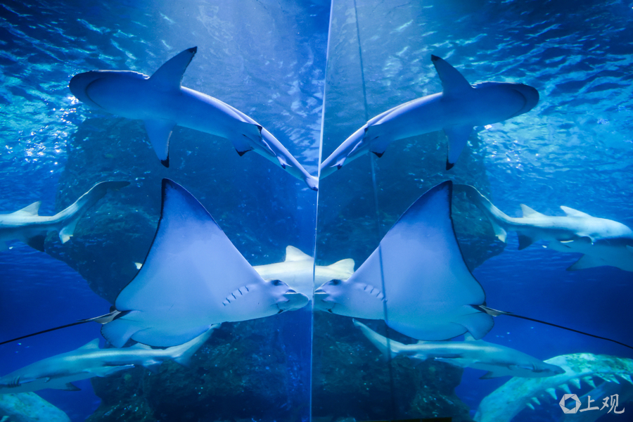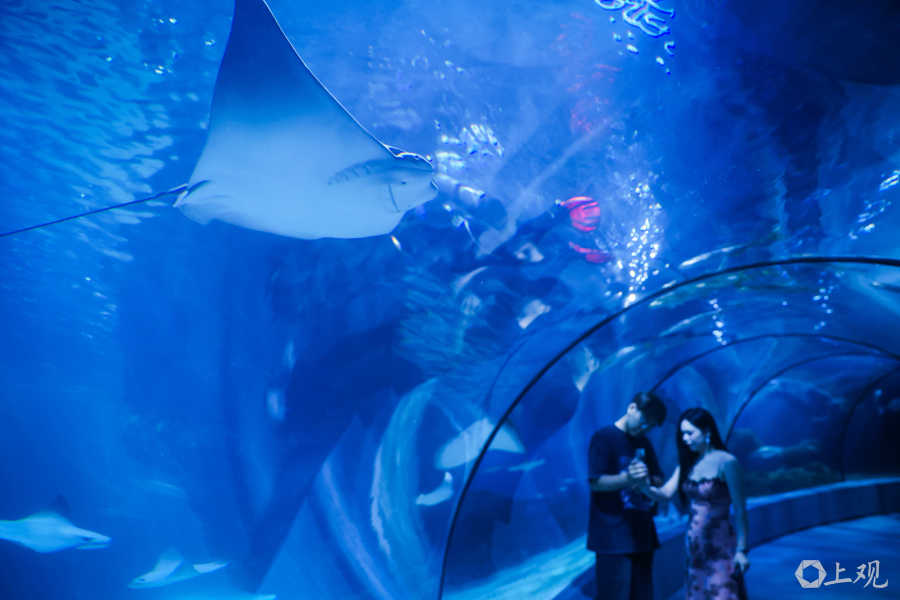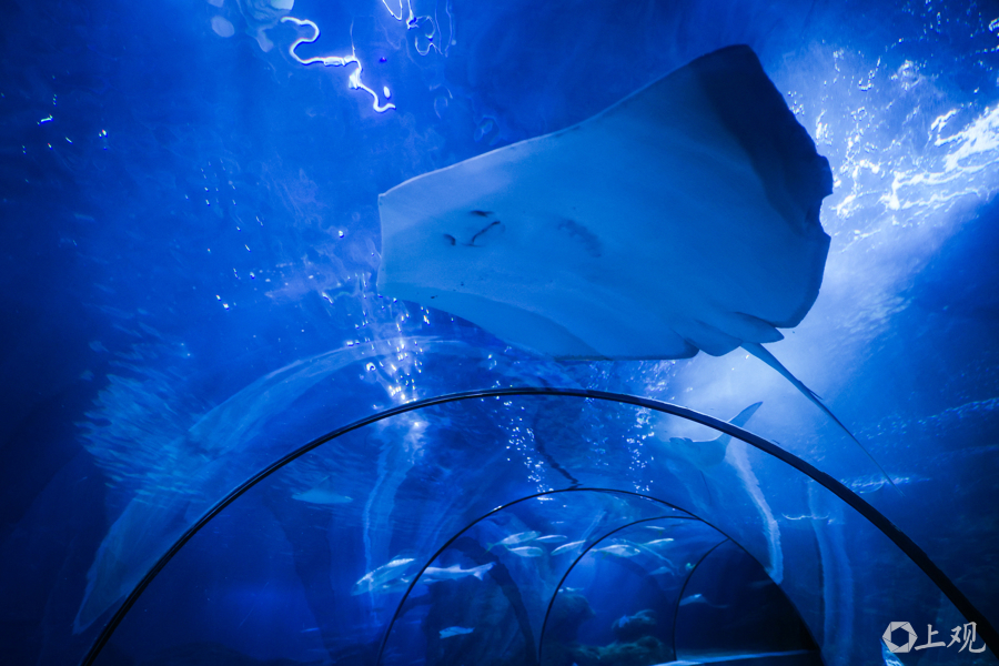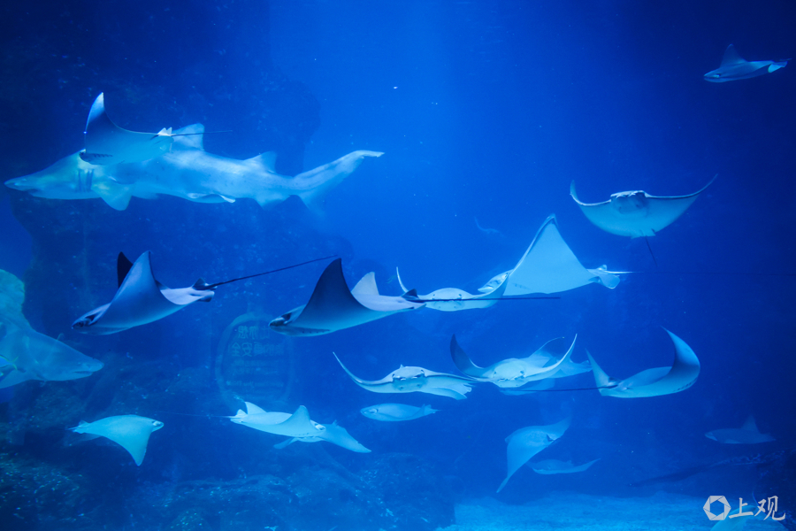 86尾、7种鳐鱼集体迁入升级后的鲨鱼甬道,全新维生系统与光影技术打造出鳐鱼与星光交织的梦幻水域,呈现鳐鱼群如星河滑行的美丽画面,成为人们打卡拍照的浪漫胜地。