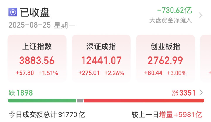 截止收盘,沪指涨1.51%,收报3883.56点;深证成指涨2.26%,收报12441.07点;创业板指涨3%,收报2762.99点。